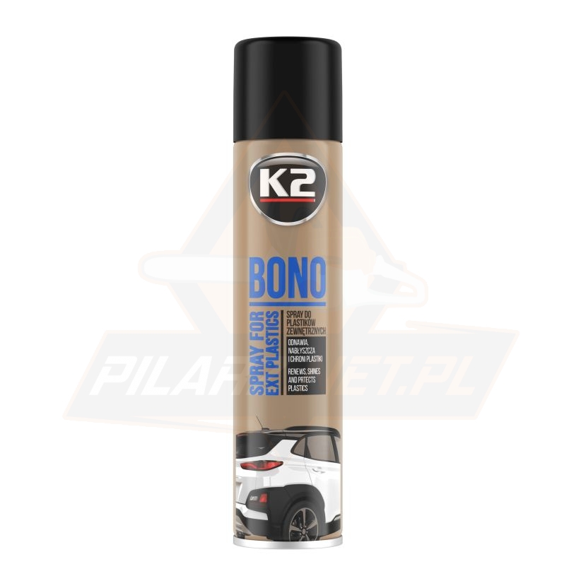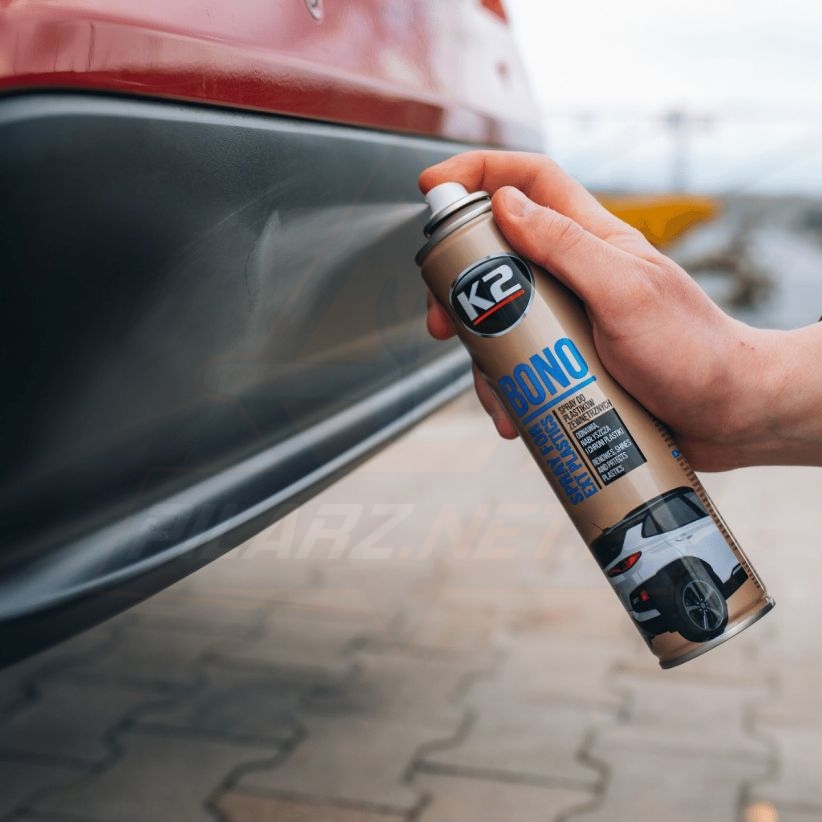 K2 BONO to prosty w użyciu środek do odnowienia plastików zewnętrznych. Wysoce skuteczny w wydobywaniu oryginalnego koloru, odnawia i zabezpiecza wszelkie powierzchnie plastikowe, winylowe oraz gumowe. Przywraca głębie plastikowym listwom, zderzakom czy osłoną nadkoli i sprawia, że wyglądają jak nowe.