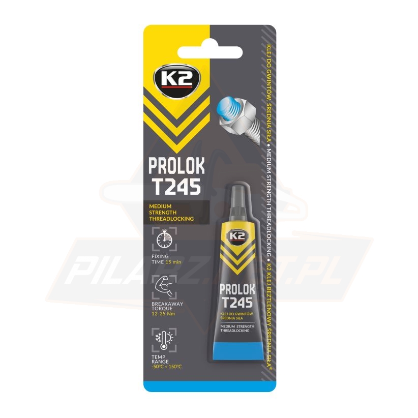 PROLOK T245 - K2 KLEJ BEZTLENOWY ŚREDNIA SIŁA® jest przeznaczony do zabezpieczenia przed odkręcaniem gwintów narażonych na wibracje i drgania. Chroni przed korozją, uszczelnia i blokuje połączenia. Zastępuje standardowe zabezpieczenia np.: podkładki. Nadaje się do stosowania w złączach ze wszystkich rodzajów metali.