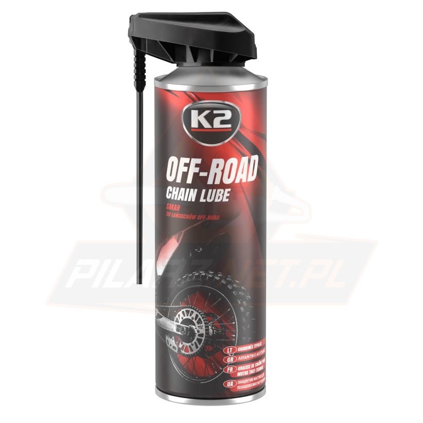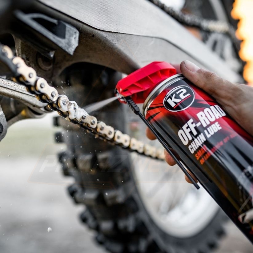K2 Smar do łańcuchów OFF-ROAD - to wysoce wydajny smar, przeznaczony do smarowania łańcuchów oraz zębatek napędowych w motocyklach terenowych oraz quadach. Dzięki właściwościom smarująco-penetrującym, wnika we wszystkie szczeliny, chroniąc łańcuch oraz zębatki przed przedwczesnym zużyciem. Można go stosować we wszystkich typach łańcuchów, x-ring, o-ring, z-ring itp.
