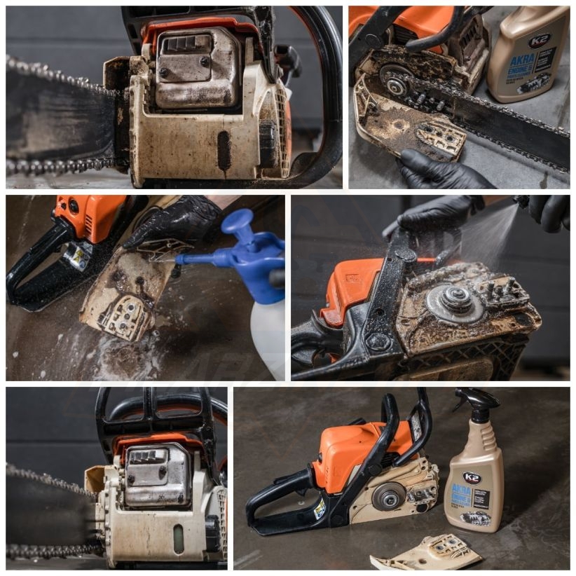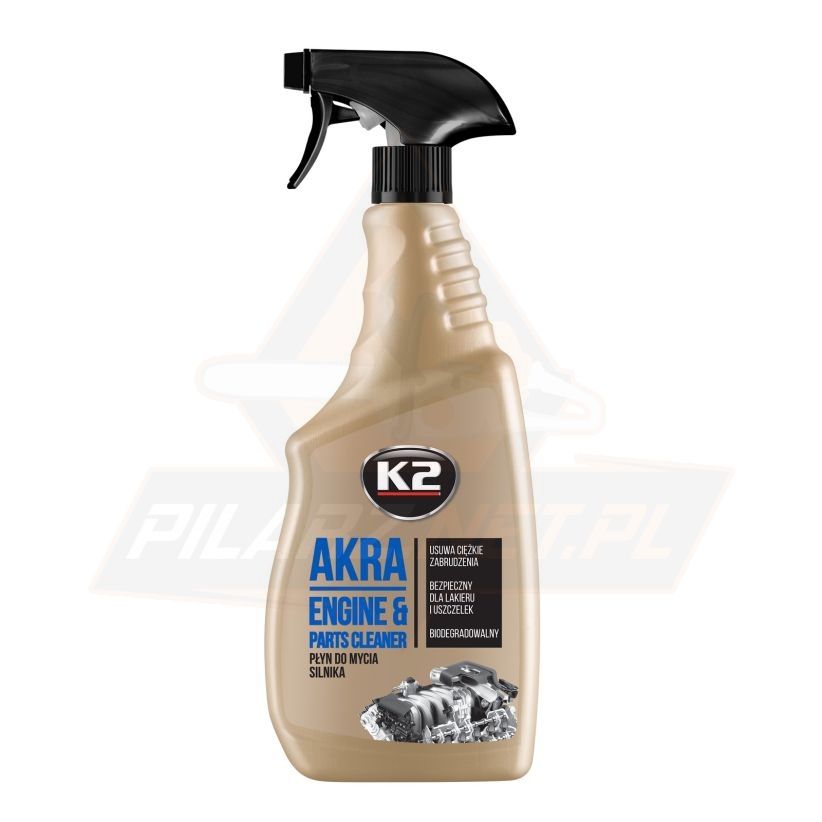 K2 AKRA – sprawdzony przez miliony klientów na całym świecie, płyn do mycia silnika i innych mocno zabrudzonych podzespołów samochodu. Jest produktem przeznaczonym do usuwania zaschniętych osadów, zacieków z płynów eksploatacyjnych, pyłów, stwardniałego brudu i lotnej rdzy. Oczyszcza silnik i inne podzespoły samochodu, a także służy do mycia narzędzi i czyszczenia urządzeń oraz powierzchni przemysłowych.