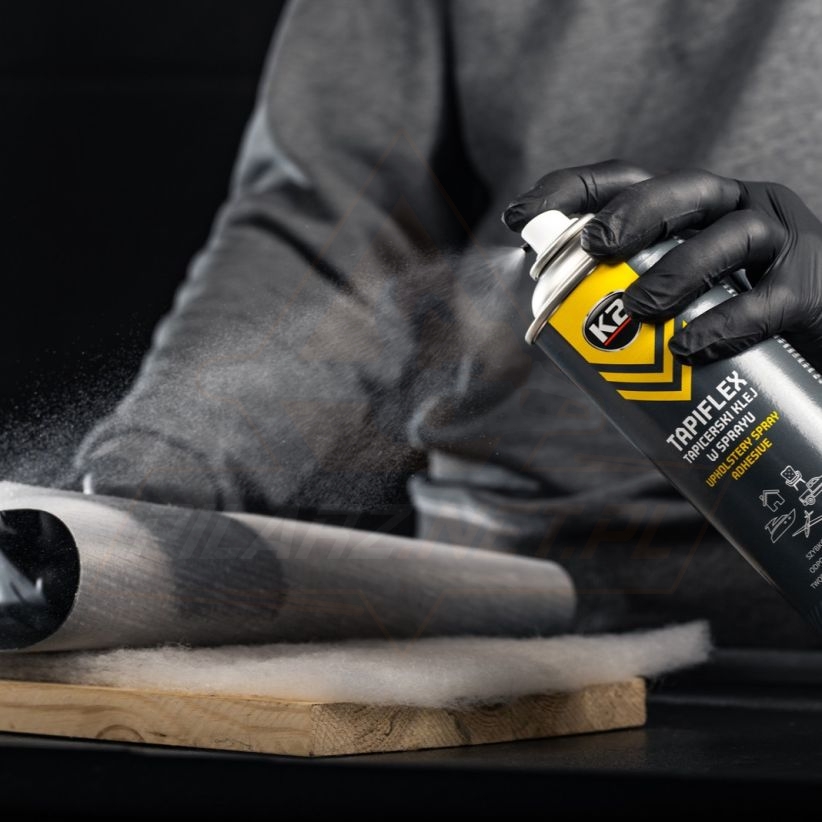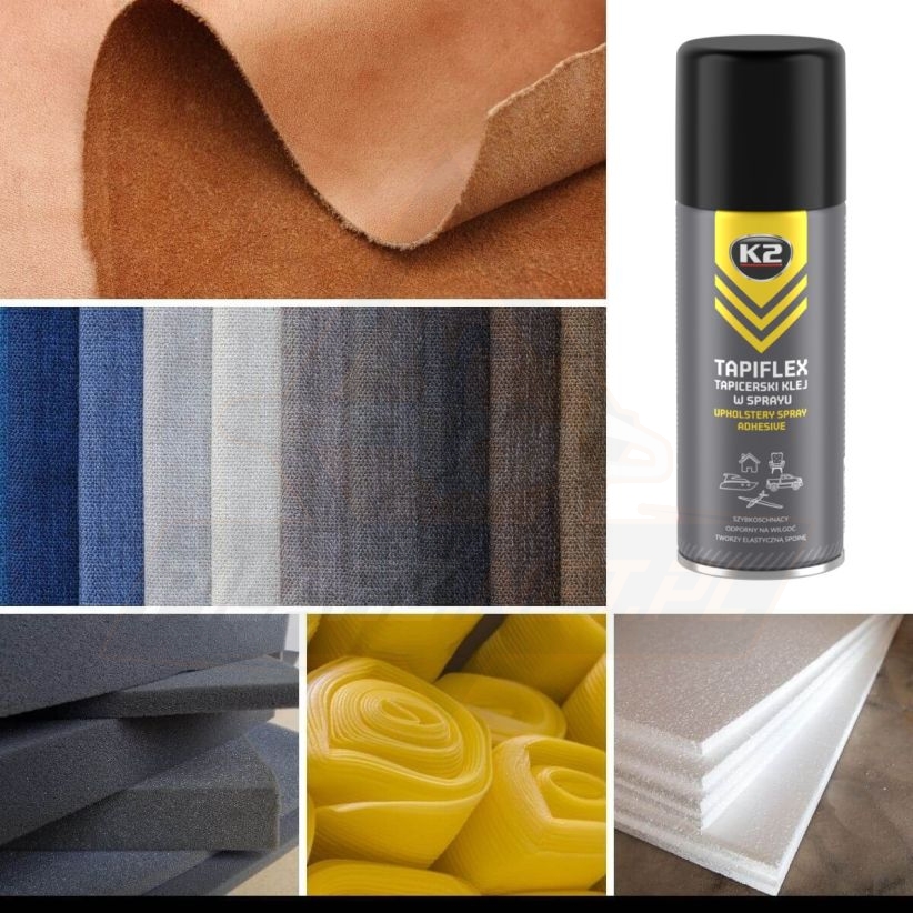 Posiada szeroką gamę zastosowań. K2 TAPIFLEX w 100% sprawdza się jako klej do podsufitki. Klei bezproblemowo: samochodową podsufitkę, obicia ze sztucznej skóry lub materiału, maty wygłuszające. Zastosowanie znajdzie podczas naprawy siedzisk czy renowacji mebli tapicerowanych. Z powodzeniem można nim mocować wycieraczki i chodniki do podłogi, wygłuszać ściany za pomocą pianki akustycznej.