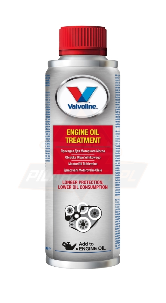 Valvoline™ Engine Oil Treatment Specjalny pakiet dodatków uszlachetniających poprawiających osiągi silnika. Zastosowania Odpowiedni do wszystkich silników benzynowych i wysokoprężnych. Preparat Engine Oil Treatment zwiększa wskaźnik lepkości, sprawiając, że olej silnikowy jest gęstszy w wyższych temperaturach, co zapewnia grubszą warstwę ochronną oleju. Podstawowe korzyści: Wydłużone okresy między wymianami oleju Niższe koszty operacyjne i wydłużony okres eksploatacji dzięki zmniejszeniu tarcia. Instrukcja obsługi Dodać preparat Valvoline Engine Oil Treatment do oleju silnikowego. Rozgrzać silnik do temperatury roboczej. Ważna uwaga: NIE przekraczać maksymalnej pojemności skrzyni korbowej. Dozowanie: Opakowanie wystarcza na 4,5 litrów oleju silnikowego. Nieszkodliwy dla silników przy stężeniu maksymalnie 20% oleju silnikowego. Dodać zawartość metalowej butelki (300 ml) do co najmniej 1,5 litra oleju silnikowego. Charakterystyka i zalety Wydłużone okresy pomiędzy wymianami oleju Preparat Engine Oil Treatment wspomaga wydłużenie okresów pomiędzy wymianami oleju. Kontrola osadów Zawiera specjalne dodatki uszlachetniające, poprawiające ochronę przed utlenianiem i rozpraszanie zanieczyszczeń. Zapobiega zużyciu i utracie oleju Zwiększona lepkość w wyższych temperaturach zapewnia lepsze uszczelnienie pierścieni tłokowych. W rezultacie zmniejsza się pobór oleju. Ochrona w skrajnych warunkach eksploatacji Specjalne dodatki uszlachetniające chroniące przed zużyciem stabilizują powłokę smarowania przy bardzo dużych obciążeniach. Zastosowanie uniwersalne Preparat Engine Oil Treatment jest przeznaczony do wszystkich silników benzynowych i wysokoprężnych.